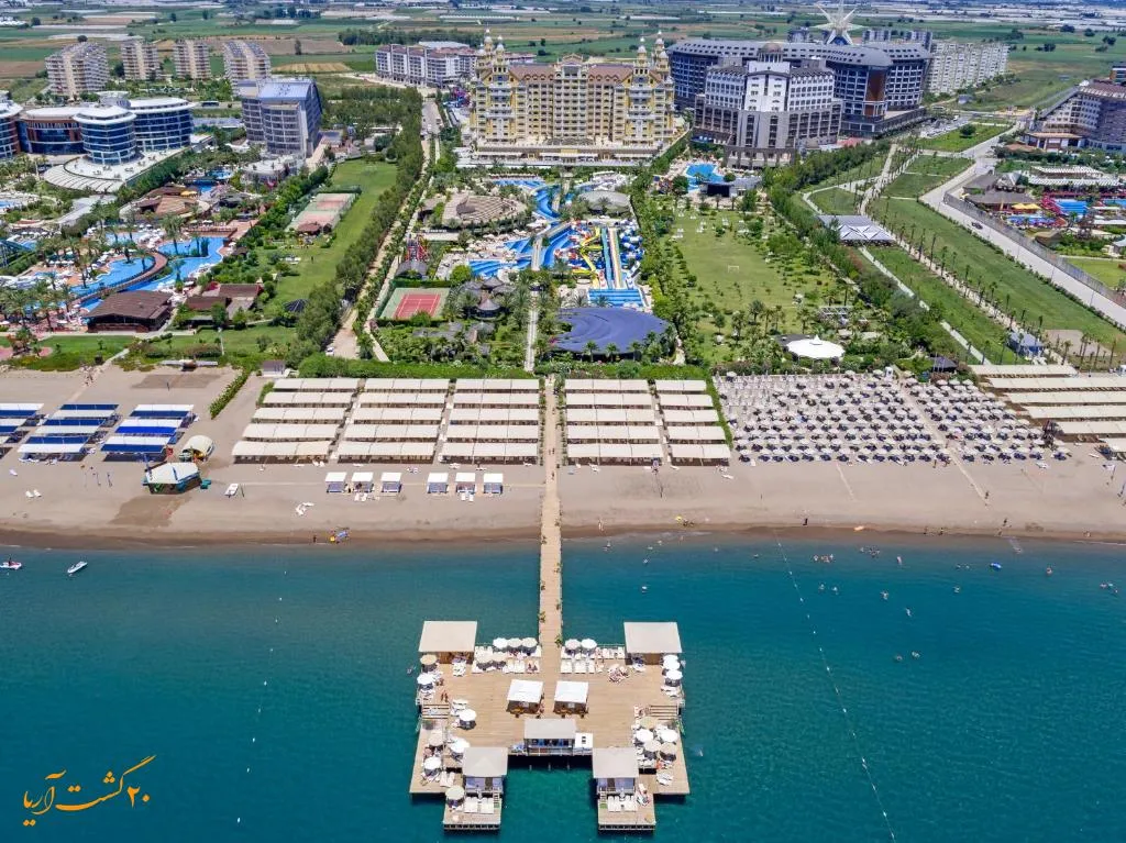 در قسمت مرکزی هتل یک باغ زیبا دیده میشود. ساحل اختصاصی آن نیز مساحت زیادی داشته و امکانات متعددی همچون نیمکتهایی برای گرفتن حمام آفتاب در آن خواهید یافت. این هتل دارای تعداد زیادی استخر سر باز، تعدادی پارک آبی مجهز به سرسرههای آبی و امکاناتی برای اجرای ورزشهای آبی می باشد. از دیگر امکانات می توان مرکز اسپا یک سونا، جکوزی، اتاق بخار و حمام ترکی آن اشاره نمود.