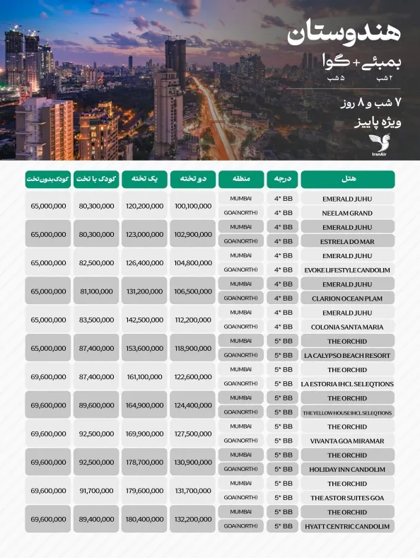 کشور هند با جذب بیش از 12 میلیون گردشگر در سال گذشته دارای رشد حدودی 15 درصدی نسبت به سالهای قبل بوده است. قیمت های مناسب تور هند به نسبت سایر شهرهای توریستی جهان یکی از عوامل افزایش تقاضای سفرهای این کشور به خصوص تور بمبئی و تور گوا می باشد و مانند بسیاری از کشورهای توریستی جهان، هند نیز با ارائه پکیج های ترکیبی از شهرهای مختلف خود سعی در جذب هرچه بیشتر گردشگران دارد. با توجه به نزدیکی شهرهای بمبئی و گوا و تفاوت جاذبه های گردشگری اصلی آنها، تور بمبئی و گوا یکی از بهترین گزینه ها برای سفرهای چند روزه به هند می باشد.